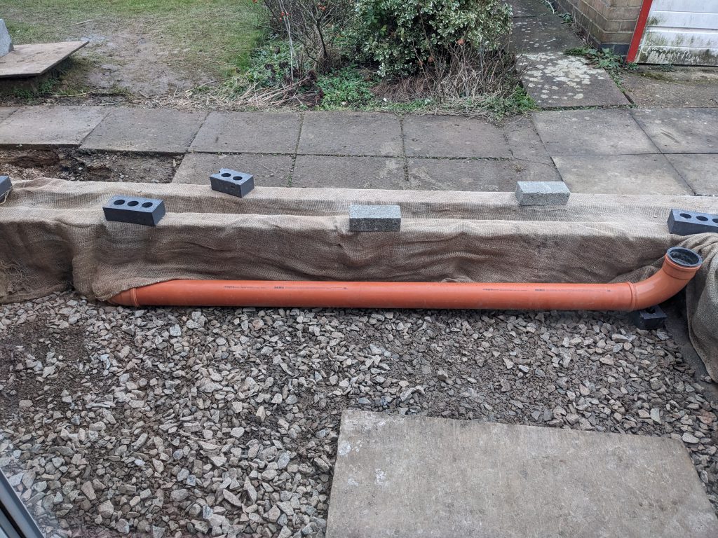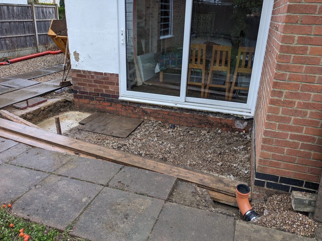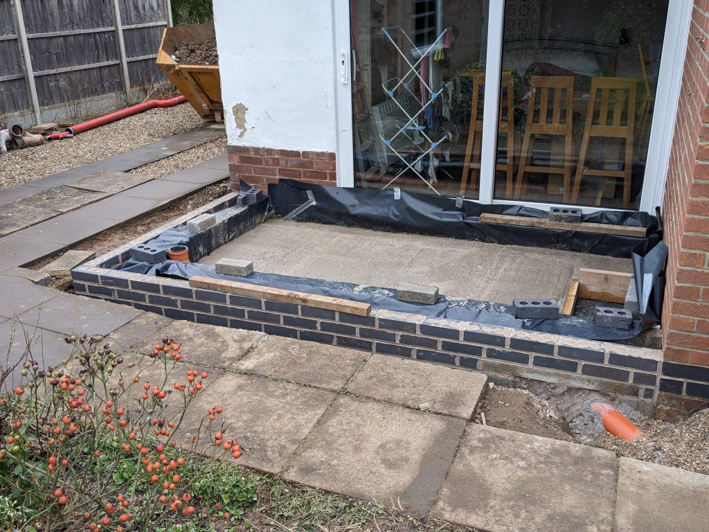 Hardcore + sand “blinding” + DP membrane + concrete “oversight”. Space on right hand near side is for shower drainage pipework.