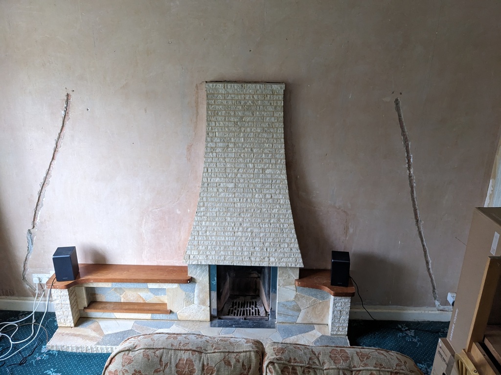 We weren’t great fans of the old fireplace. It hadn’t been used for some time because the chimney had been capped. Prior to the stove man’s arrival I stripped the wallpaper to reveal some interesting plasterwork from the two sockets on either side of the fireplace, to the wall lamps. The lights themselves weren’t part of the lighting circuit – instead there were a couple of wires emerging out of the plaster by the sockets with some 3 pin plugs attached to the end. To switch the lights on/off you had to plug/unplug them. Unique, to say the least! I removed some loose filler to discover there was no metal casing, just the wire so I decided to grab a plug and pull to see what would happen. I ended up with what you see in the picture. Nice eh!