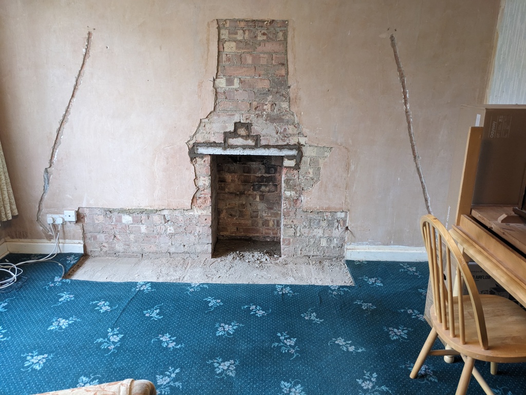 The first job was to remove the old fireplace. Then a quantity of bricks were removed to form an alcove into which the new stove would sit. The top line of the alcove had a reinforced concrete lintel fitted and brickwork added where necessary to square things up.