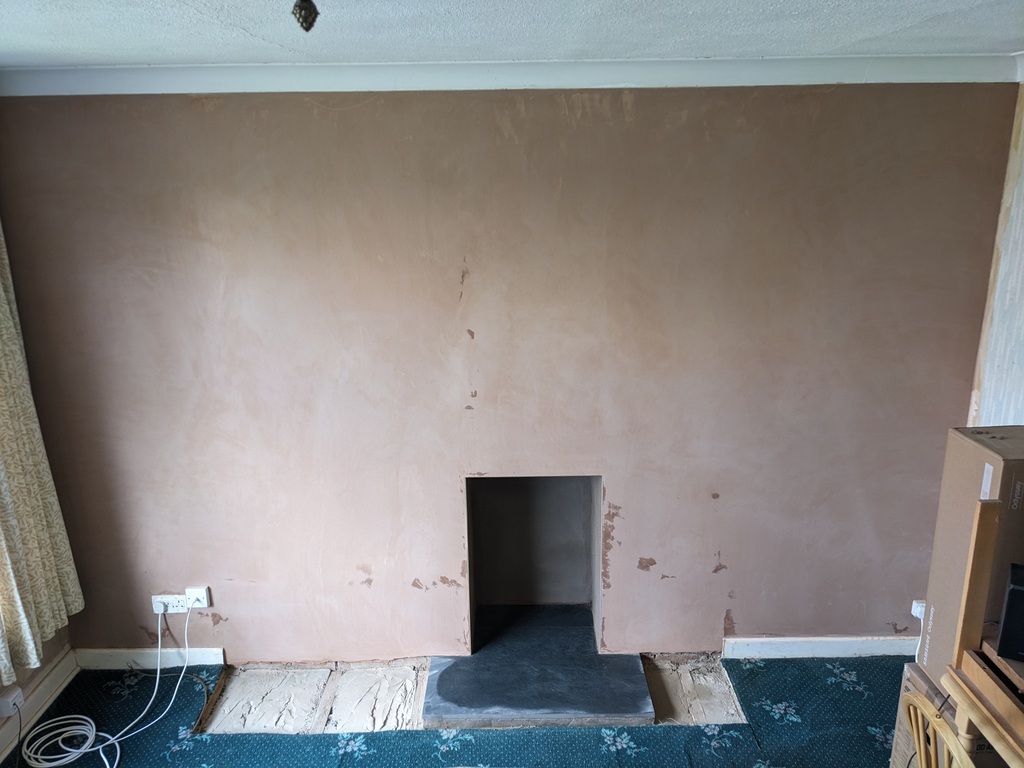 Next, the wall was plastered and the alcove rendered with a special heat resistant coarse render. I did tell the plasterer that it wasn’t necessary to skim the whole wall because we would have to have it chased out when we re-wire, but he decided it would be easier to do the whole wall rather than just patch up the channels left when the old wall lights were removed. It gave us a chance to see the quality of his work which we have to say was excellent!
