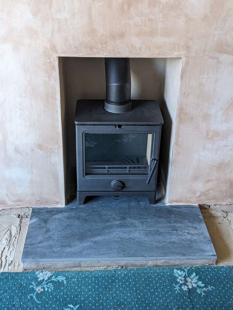 There was some debate on whether or not to have a stove, primarily about its emissions. The problem we have is that the area has no mains gas available so everyone in the area has had to use alternative fuels to heat their homes. This bungalow had a mix of old storage heaters (which we discovered were no longer connected), electric panel heaters and a knackered old oil filled radiator in the bathroom. Many if not all the people in the area had open fires and stoves for supplementary heating and we decided it would be a quick fix to get heating into the place during cold spells. In truth, you can’t beat a real fire!